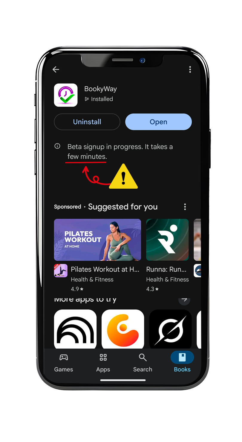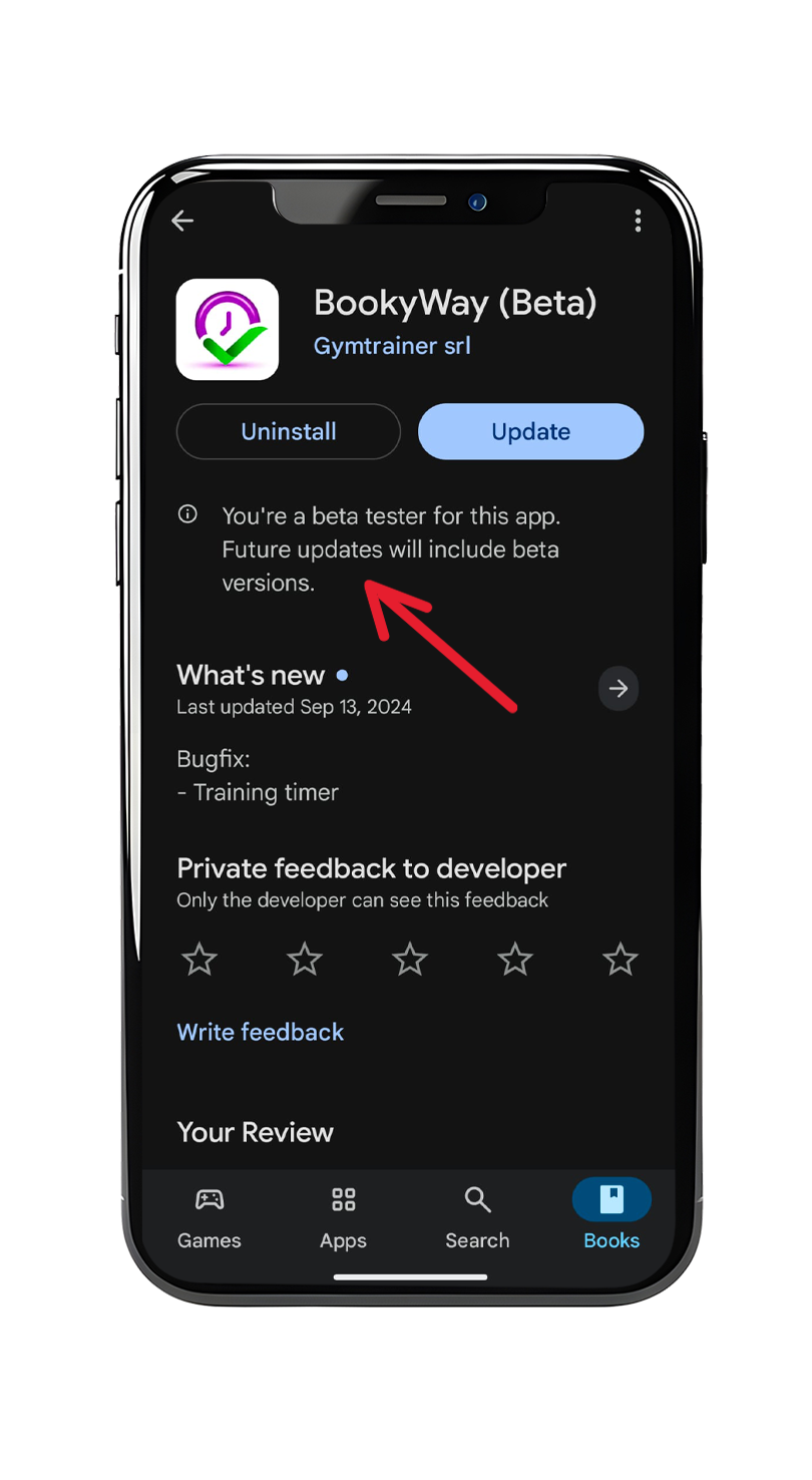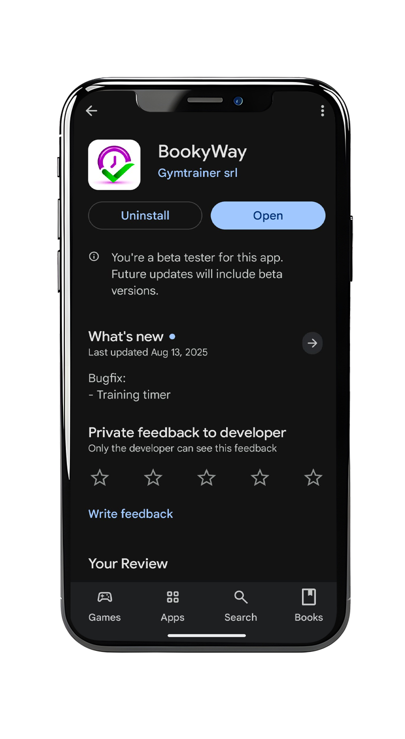- En Android: abre la página de BookyWay en Google Play, desplázate hasta la sección Beta tester y toca en “Salir”. Luego desinstala la aplicación y vuelve a instalarla normalmente desde la tienda.