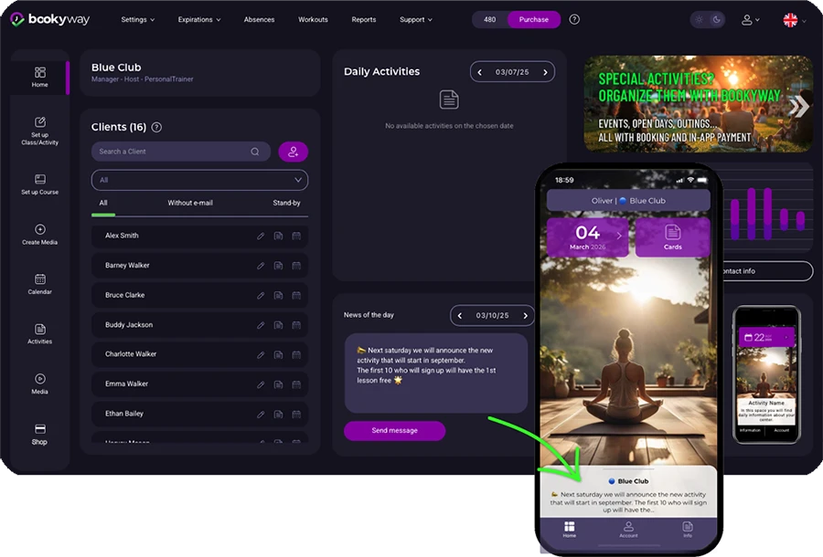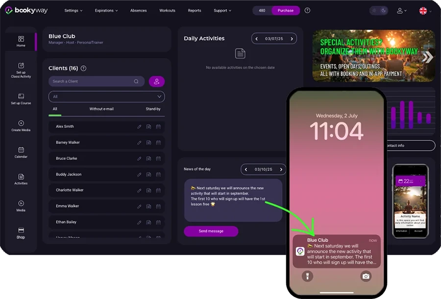 Con BookyWay puoi inviare comunicazioni rapide ed efficaci direttamente ai clienti che utilizzano l’app, mantenendo sempre un contatto chiaro e professionale.