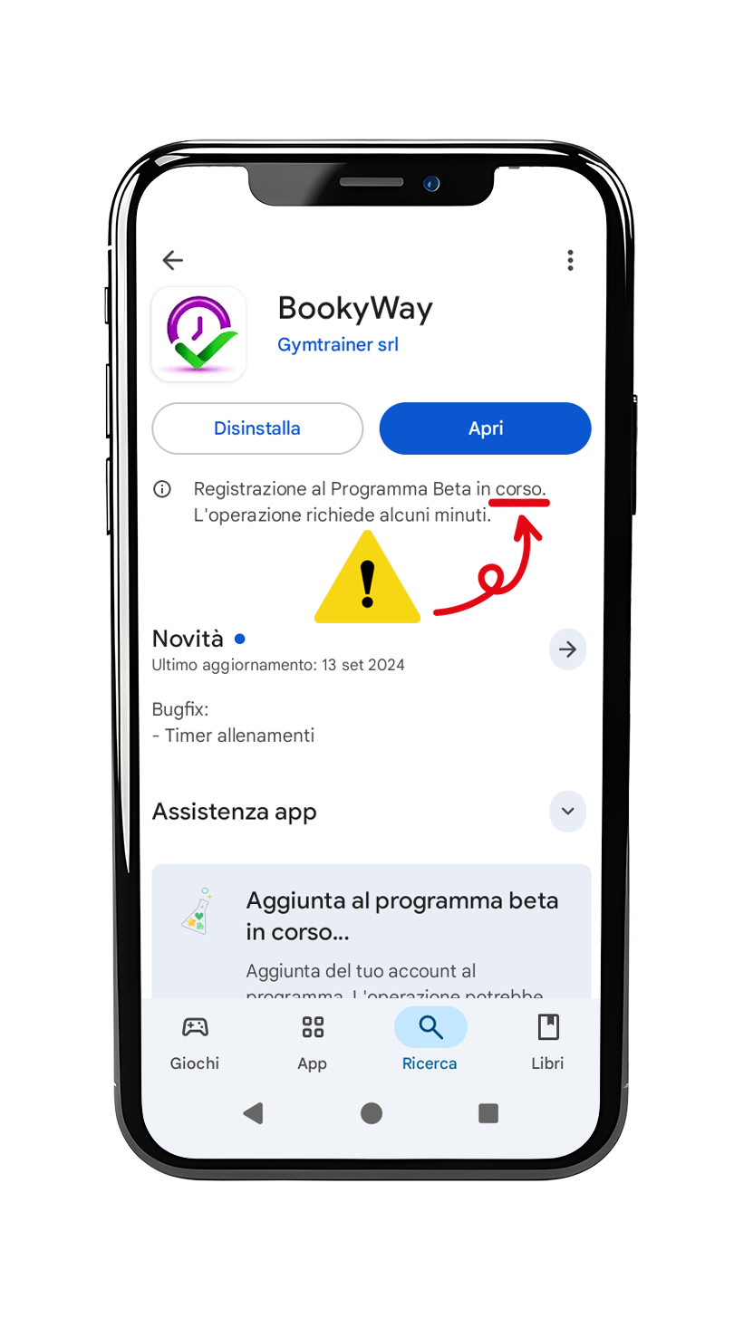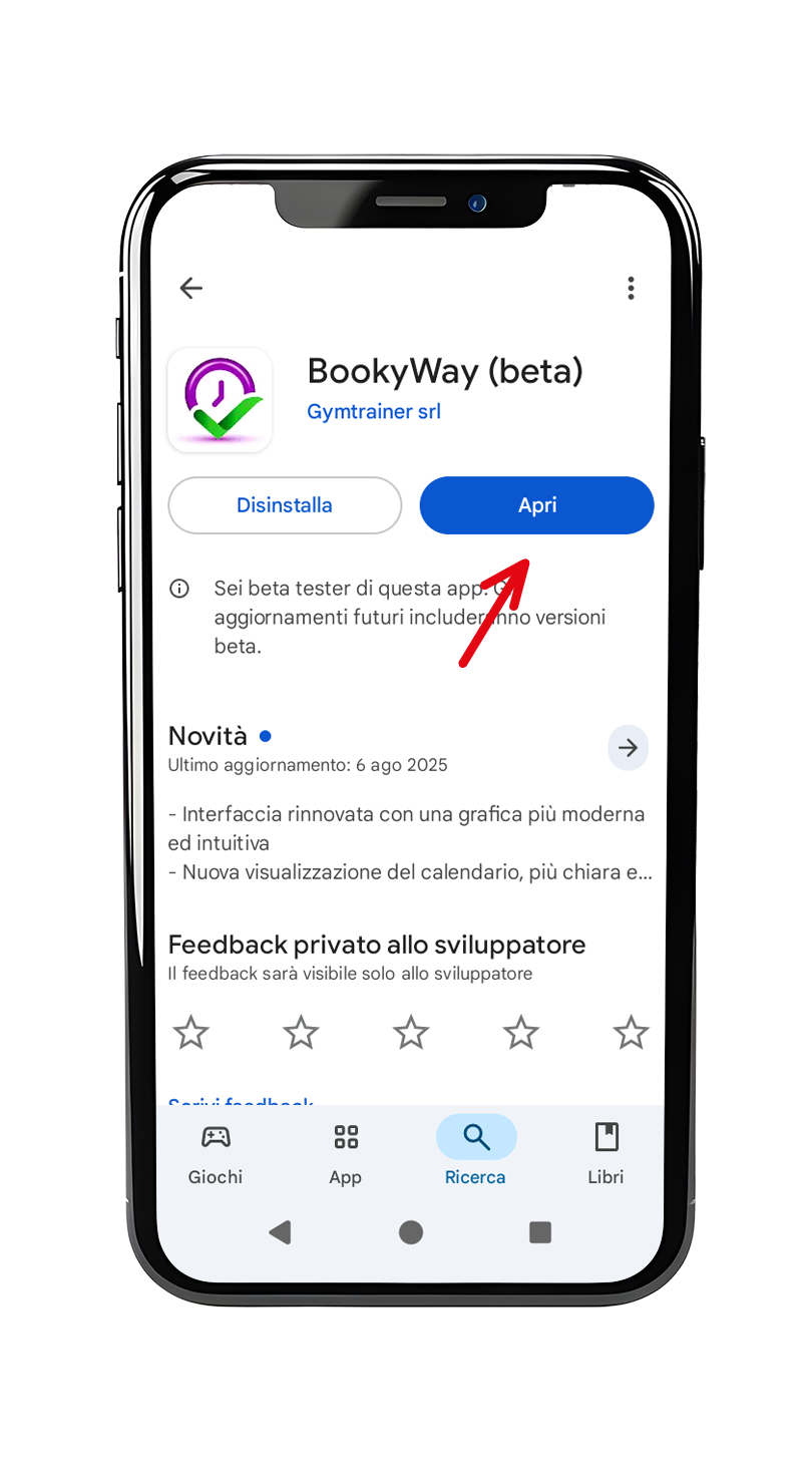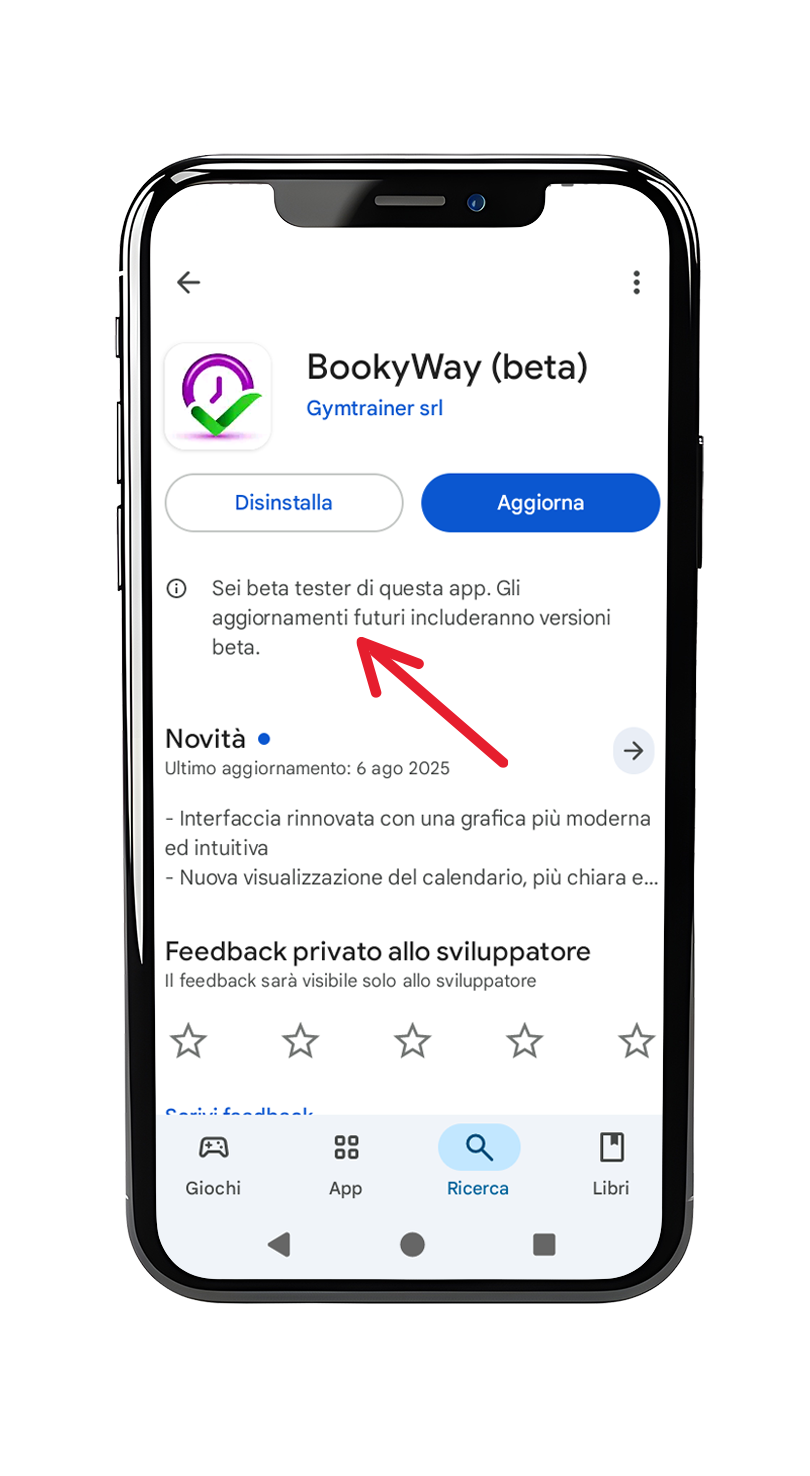 • Da Android: apri la pagina di BookyWay su Google Play, scorri fino alla sezione Beta tester e tocca “Esci”. Poi disinstalla l’app e reinstallala normalmente dallo store.